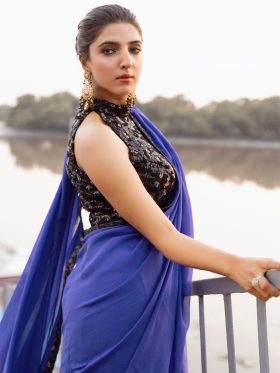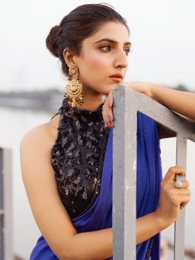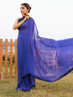 Elevate your allure with our stunning blue georgette sari, a timeless symbol of grace and elegance. Crafted with finesse, this ethereal ensemble drapes you in sophistication, its gentle folds whispering tales of timeless beauty. Paired effortlessly with a classic black georgette blouse, this ensemble exudes understated glamour and sophistication. Embrace the elegance of georgette, and let your style speak volumes of timeless charm and grace