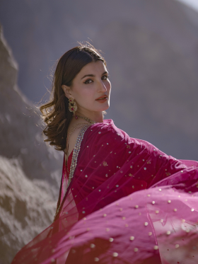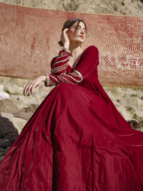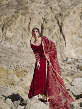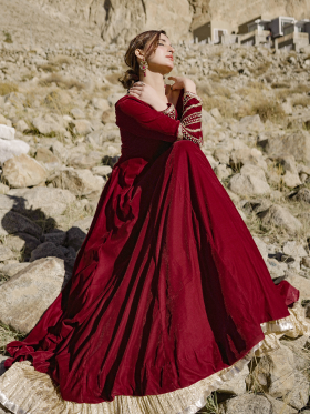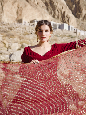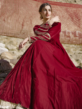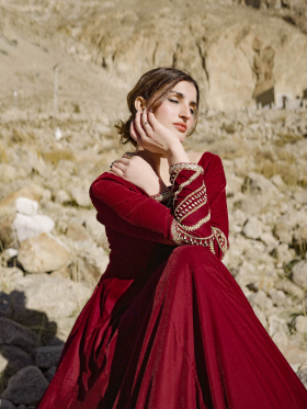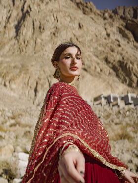 Dive into elegance with the rich allure of deep maroon! The sleeves boast intricate embroidery, while the ensemble is elevated by a lavish organza dupatta adorned with gold Kaamdani. Embrace the perfect blend of tradition and sophistication.