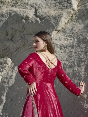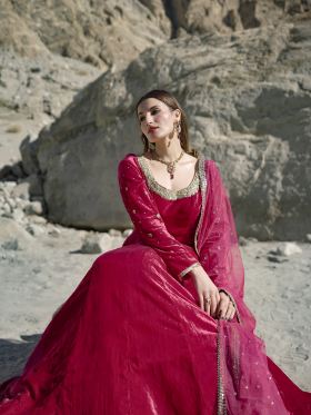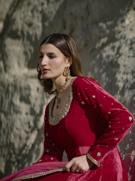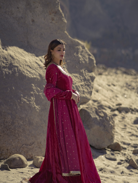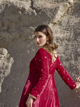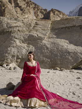 Immerse yourself in the artistry of precision and beauty—velvet pashwaz adorned with intricate hand embroidery, a soft net dupatta with sequins spray, and a regal gold crushed skirt for the perfect touch of glamour. It’s not just fashion; it’s a symphony of sheer elegance