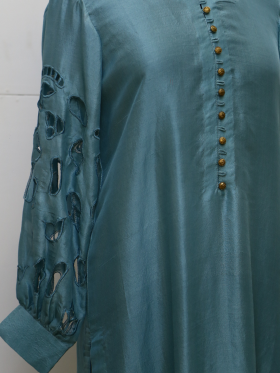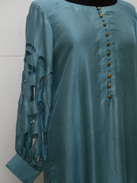 Step into sophistication with our premium silk ensemble featuring exquisite cut work detailing on the sleeves. Paired with plain pants for a touch of elegance and an organza embroidered dupatta for added allure, this ensemble redefines luxury with every stitch. Elevate your style and make a statement that captivates.