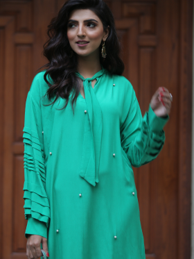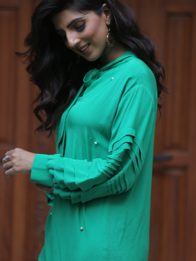 Infuse your wardrobe with a dash of Western flair and desi charm with our simple yet stylish green top. Perfect for adding a touch of versatility to your look, this top effortlessly blends Western elements with desi influences. Elevate your style game with this chic fusion piece.