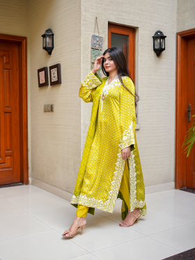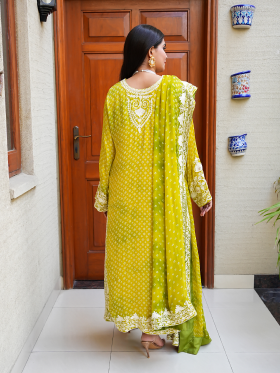 Embrace elegance in every detail with our Dhani green printed silk ensemble. Featuring exquisite machine embroidery that adds a unique and captivating charm to the design. Complete the look with a printed dupatta adorned with stunning machine work embroidery. Elevate your style with sophistication and grace.