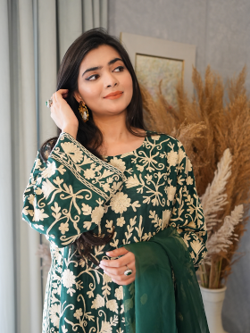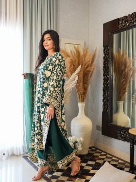 Elevate your wardrobe with our exquisite green ensemble: Featuring heavy machine embroidery on the front and back of the dress, paired with premium silk pants boasting embroidered borders. Complete the look with our stunning organza dupatta, adorned with intricate machine embroidery.