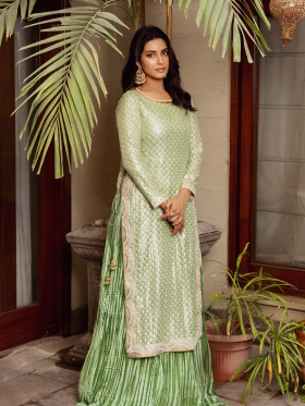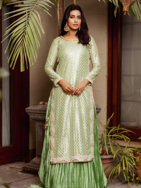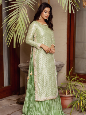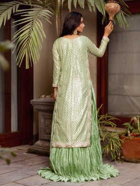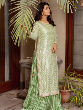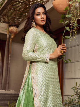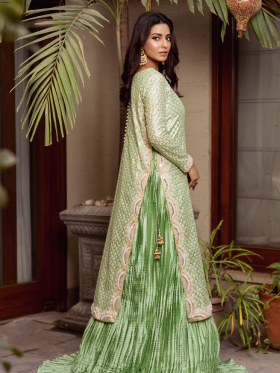 Introducing ‘Shamrock’, an epitome of sophistication and grace. This luxurious green frock, crafted from premium silk, radiates opulence with every fold. Adorned with an embroidered coat, ‘Shamrock’ exudes regal charm and timeless elegance. Elevate your wardrobe with this enchanting ensemble, where premium fabric meets intricate craftsmanship, creating a masterpiece that commands attention and admiration. Embrace luxury with ‘Shamrock’ and make a statement that resonates with grace and style.